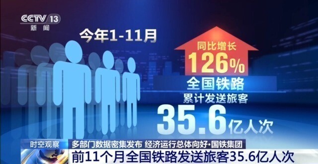 作为经济社会发展活力的晴雨表,交通运输领域的数据也出现了大幅增长。国铁集团最新数据显示:今年1至11月,全国铁路累计发送旅客35.6亿人次,同比增长126%。单日旅客发送量、售票量等客运指标均创历史新高。