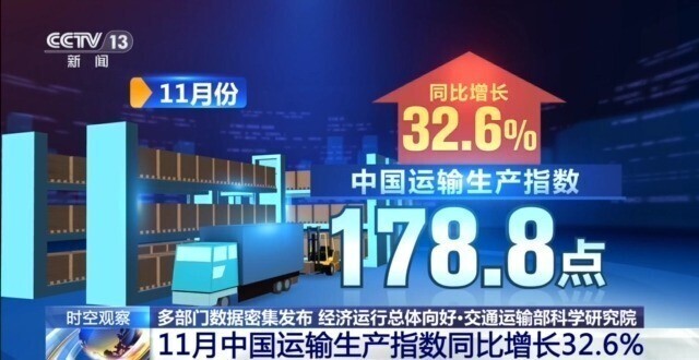 而交通运输部科学研究院发布的数据显示:11月份,中国运输生产指数为178.8点,同比增长32.6%。其中,货运指数为211.2点,同比增长12.9%,增速较10月加快1.7个百分点。钢铁、粮食、煤炭等货运量有所增长。