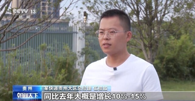 某快递贵州大区总经理 伍桂如:今年我们乡镇的业务量同比去年大概是增长10%~15%。增长品类最多的是3公斤以上的大件货物,家居和家电增长是最多的,增幅在20%左右。