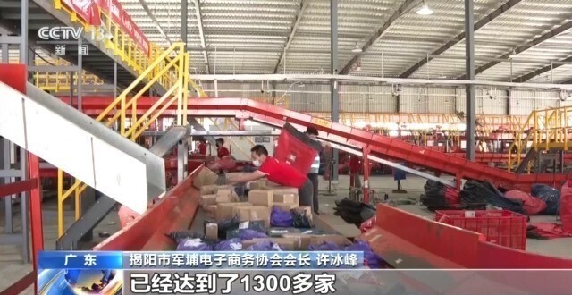 揭阳市军埔电子商务协会会长 许冰峰:军埔村在2012年之前是一个典型的农村,依托电商之后,这边产生了一个货物的集散地,全国各地包括周边生产的货物都往这边集中,快递也是围绕大军埔电商圈周边进行设站去运转。现在电商规模实体批发已经达到了1300多家。