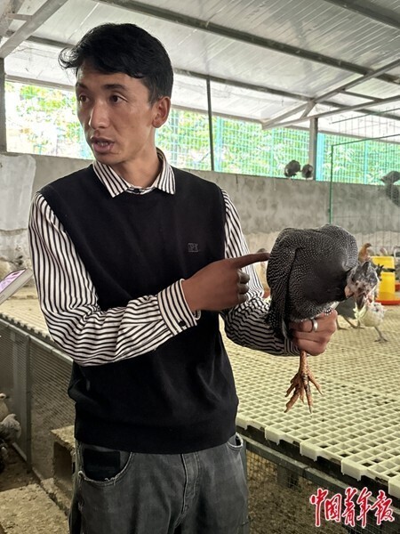 格茸尼玛2017年从云南农业职业技术学院畜牧兽医专业毕业后,到云南一家养鸡场实习,学会了鸡苗孵化、疫苗接种、育雏与脱温鸡的日常管理。一年后,他回乡创业,选择养殖蛋白质含量高的珍珠鸡。但这个新品种出栏后,几周都没卖出去。格茸尼玛不得不在香格里拉市农贸市场租了一个店铺。经过发放宣传单、与火锅店合作、线上生鲜冷链等多种推销手段,终于打开销路,几千只珍珠鸡销售一空。