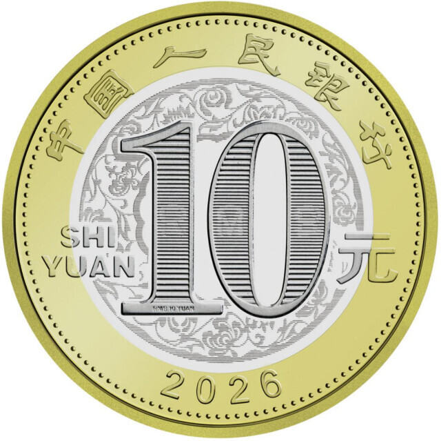 双色铜合金纪念币正面图案为“中国人民银行”“10元”字样,汉语拼音字母“SHIYUAN”及年号“2026”,底纹衬以团花图案。