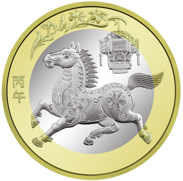 双色铜合金纪念币背面图案为中国传统剪纸艺术与装饰年画元素相结合的马形象,衬以花灯和萱草图案,币面左侧刊“丙午”字样。