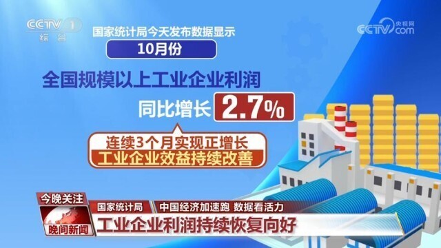国家统计局11月27日发布数据显示,10月份,全国规模以上工业企业利润同比增长2.7%,连续3个月实现正增长,工业企业效益持续改善。10月份,工业生产稳定增长,产品销售率连续4个月保持在97.0%以上,带动企业营收持续改善。其中,规上工业企业营业收入同比增长2.5%,增速较9月份加快1.3个百分点,连续4个月回升。