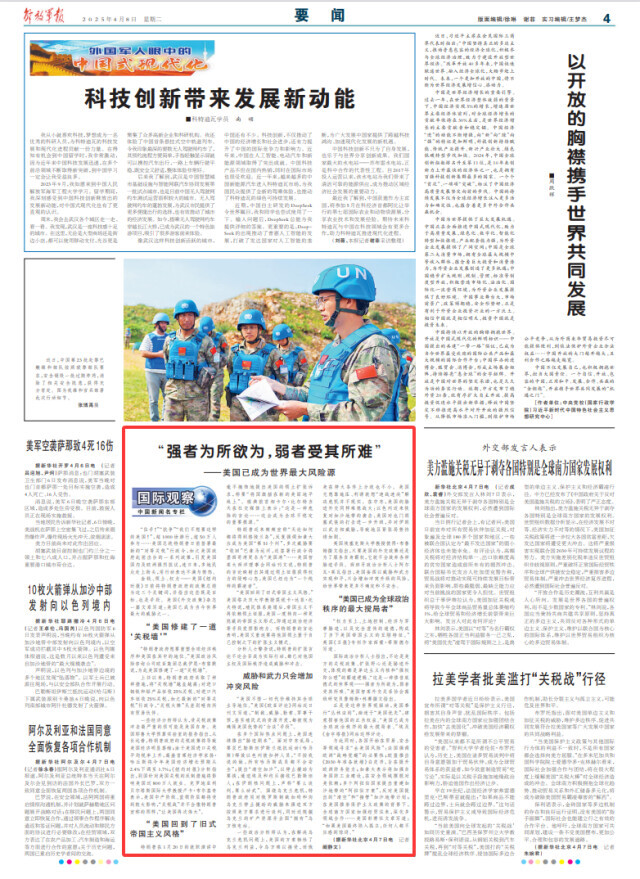 国际政治分析人士指出,不论是美方的关税政策、扩张野心还是胁迫外交,体现的都是单边主义内核和“强权即公理”的霸道逻辑。“这是一种修昔底德式的世界观——强者为所欲为,弱者受其所难。”美国智库外交关系协会高级研究员詹姆斯·林赛撰文指出。