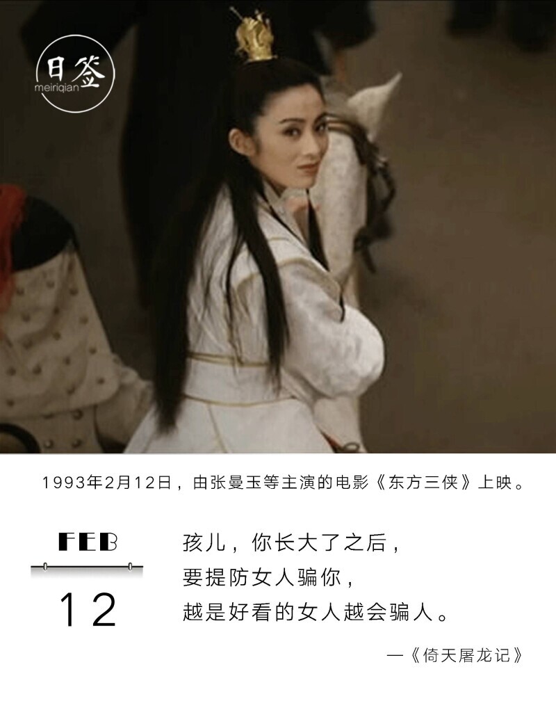 在手指快速切换的惯性中,荧幕上快速闪过了一个背影,然后立即从葛优瘫中立起,快速回拨到那个台——那个镜头我滚瓜烂熟,只有几秒的时间,晚了就看不到了——是1993年的武侠片《倚天屠龙记之魔教教主》由张敏扮演的赵敏女扮男装首次出场,身骑白马蓦然回首微微含笑的那个镜头。