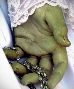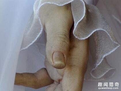 哇~的确跟普通的假人长得完全不一样(盯)。传说这前任老板最宠爱的女儿,是在结婚当天,不幸被黑寡妇蜘蛛咬死的。之后没多久,就出现了这个很像真人的橱窗假人,因此当地人就开始说她就是老板女儿的尸体做的。老板后来发出声明否认这是女儿的尸体,但已经来不及了,大家对这个传说都已经深信不疑。刚才看过她的脸部了,接下来要放的照片是她的手部,连放三张,从远到近到特写。看到第三张特写的时候,那个真实感真的有让我深呼吸一下。