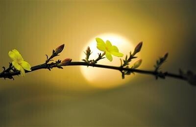 一株绽放的迎春花与倒映在水中的太阳相映成趣 赵春亮 摄