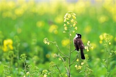小鸟在油菜花丛中小憩 贺春雨 摄