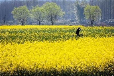 拍摄一片花海时,应注意花海与周围环境的呼应,图为一位村民经过油菜花田 张端 摄