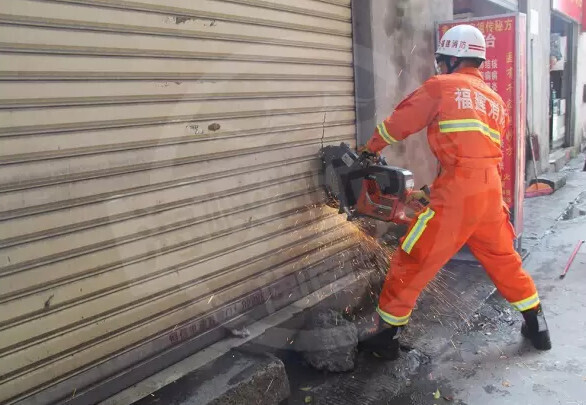 房东说,里面反锁了,他无法打开,这才请求消防官兵帮助。消防官兵从门口就闻到一股难闻的气味。消防官兵拿来房东的钥匙尝试,还是未能打开店面,就开始用切割机将卷帘门左右各割开一道口。