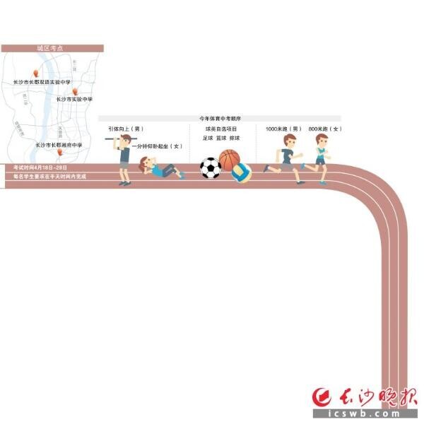 长沙晚报讯(记者 岳霞 实习生 孙洁)体育中考来了,小宇宙准备好要爆发了吗?今年全市参加体育中考的考生共有77408人,无特殊情况都要参加,城区初中毕业生(不含外地回长学生、外来务工人员子女)约37939人,比2016年增加713人。今年城区体育中考采取封闭式管理的方式,统一集中在三个考点进行,分别是长沙市实验中学、长沙市长郡湘府中学、长沙市长郡双语实验中学,时间为4月18日-28日。