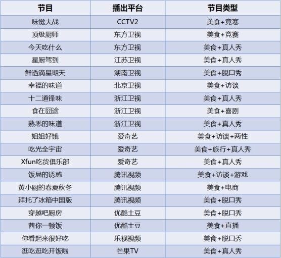 根据上表统计,美食综艺中叠加的节目类型非常多元,从旅行、喜剧到两性、游戏,可以说美食类是所有综艺题材中兼容性最强的一种。美食是生活和情感最普遍的载体,挖掘这些与美食相关的元素能够丰富节目内容,而多元类型叠加也给观众带来了节目的新鲜感,从某种程度上讲,这也是未来保证美食类节目不断更新变化的一种创新手段。