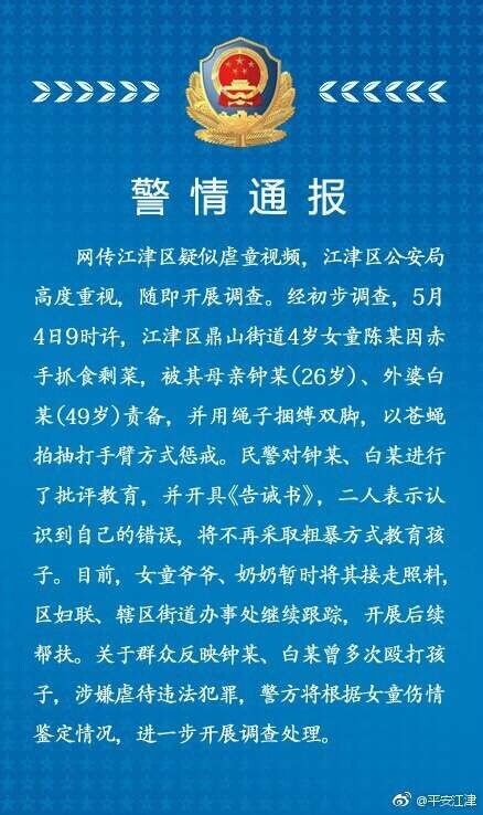 江津警方介绍,经查,5月4日上午9点过,江津区鼎山街道4岁女童陈某因赤手抓食剩菜,被其母、外婆责备,并用绳子捆缚双脚,以苍蝇拍抽打手臂方式惩戒。