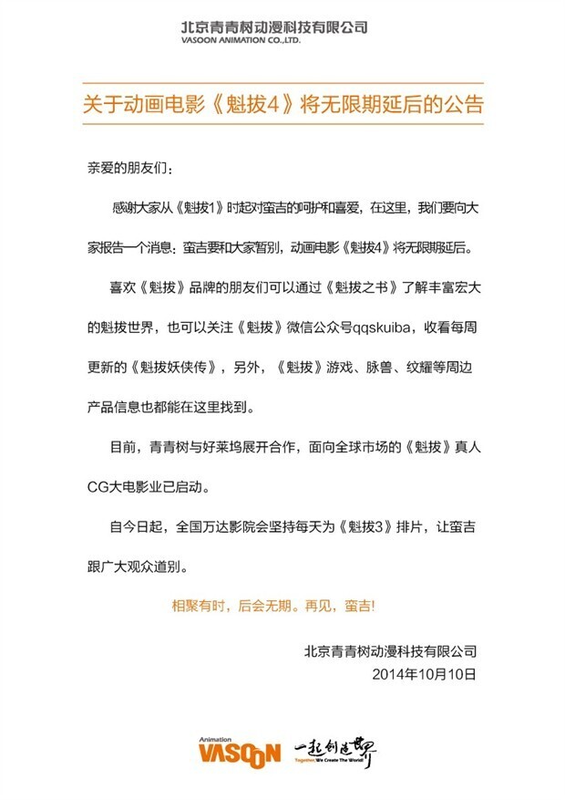 自《魁拔》系列大动漫上映以来一直广受关注,但《魁拔》系列的大动漫的票房却是一直不理想。今日,《魁拔》系列动漫的制作方北京青青树动漫科技有限公司发表声明,称动漫电影《魁拔4》将无限期延后,正在上映的《魁拔Ⅲ战神崛起》或将成《魁拔》系列的最后一部大电影。