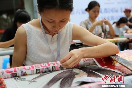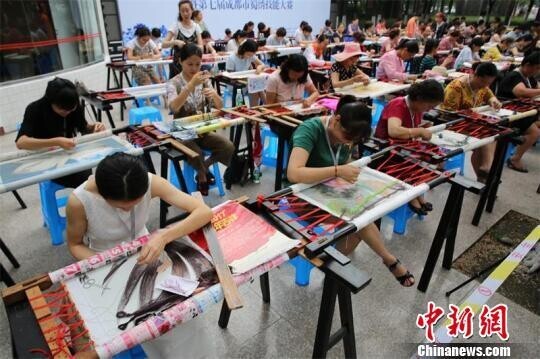 中新网成都6月11日电(王爵)11日,第六届中国成都国际非物质文化遗产节暨第七届成都市蜀绣技能大赛在郫都蜀绣文化广场举行。来自成都100多名蜀绣师同台一展刺绣技艺。