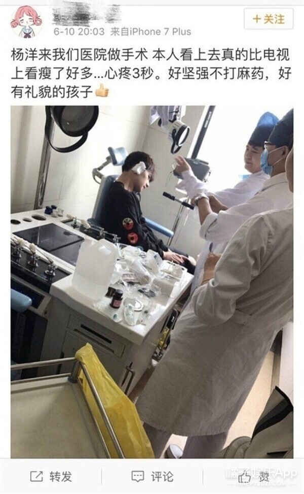 10号晚上,,网上传出杨洋正在进行手术治疗的照片,拍照的医生还说他“好坚强不打麻药”: