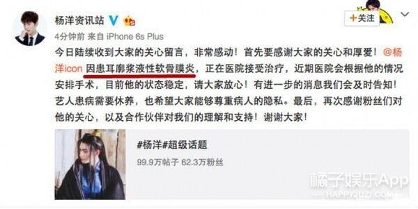 “杨洋因患耳廓浆液性软骨膜炎,正在医院接受治疗,近期医院会根据他的情况安排手术,目前他的状态稳定。”