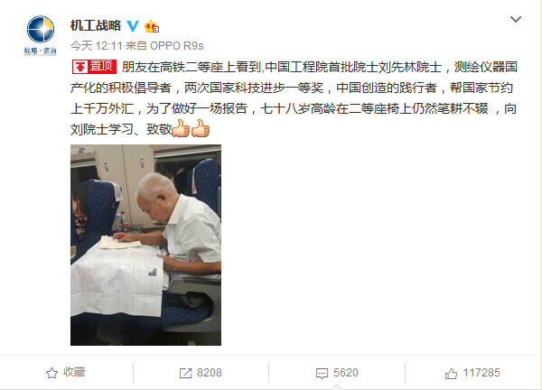 然而博主的配文却显示这位老先生是个非常了不得的大人物:朋友在高铁二等座上看到,中国工程院首批院士刘先林院士,测绘仪器国产化的积极倡导者,两次国家科技进步一等奖,中国创造的践行者,帮国家节约上千万外汇,为了做好一场报告,七十八岁高龄在二等座椅上仍然笔耕不辍,向刘院士学习、致敬。