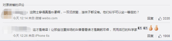 这位很细心的网友:这院士穿得真是朴素啊,一双旧皮鞋,连袜子都没有。他们似乎可以坐一等座的?