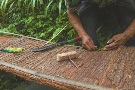 一个背带磨得光亮的竹制背篓,装着准备好的树皮、镰刀、竹竿、自制钻孔工具等,放置在雨亭石阶下,修葺茅亭的工作,即将铺展开来。