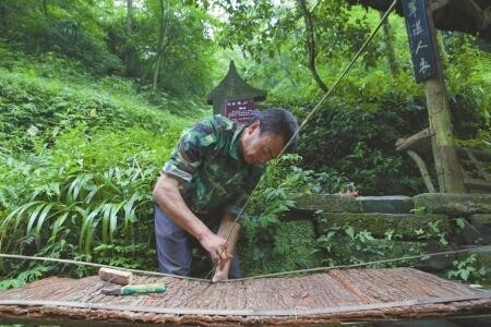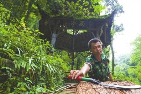 “这里的亭子有三面、五面、六面的,共126个茅亭。都很典雅漂亮,盖一个亭子,从立柱到盖亭,差不多需要20多天。”刘崇贵,都江堰市青城山镇青景村的本地人,在青城山景区修葺茅亭已有10多年。因为长期巡山,皮肤被晒得黝黑,长期攀爬,人显得精瘦。一件略显宽大的军绿色外套,因为爬上爬下,已有些脏。