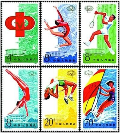 1987年11月20日发行一套4枚《中华人民共和国第六届运动会》纪念邮票;1993年9月4日发行一套1枚《中华人民共和国第七届运动会》纪念邮票;2001年11月11日发行《中华人民共和国第九届运动会》纪念邮票,全套2枚,同时发行这套邮票的小全张。这三套邮票设计都是采用抽象技法表现主题。《中华人民共和国第七届运动会》纪念邮票图案是在象征“7”字的斜弯彩色跑道上,一名手持火炬奔跑运动员的白色剪影。而另两套图案则表现的是几个运动项目竞技连续动作的剪影或连续动作的线条。画面简洁,动感强烈。