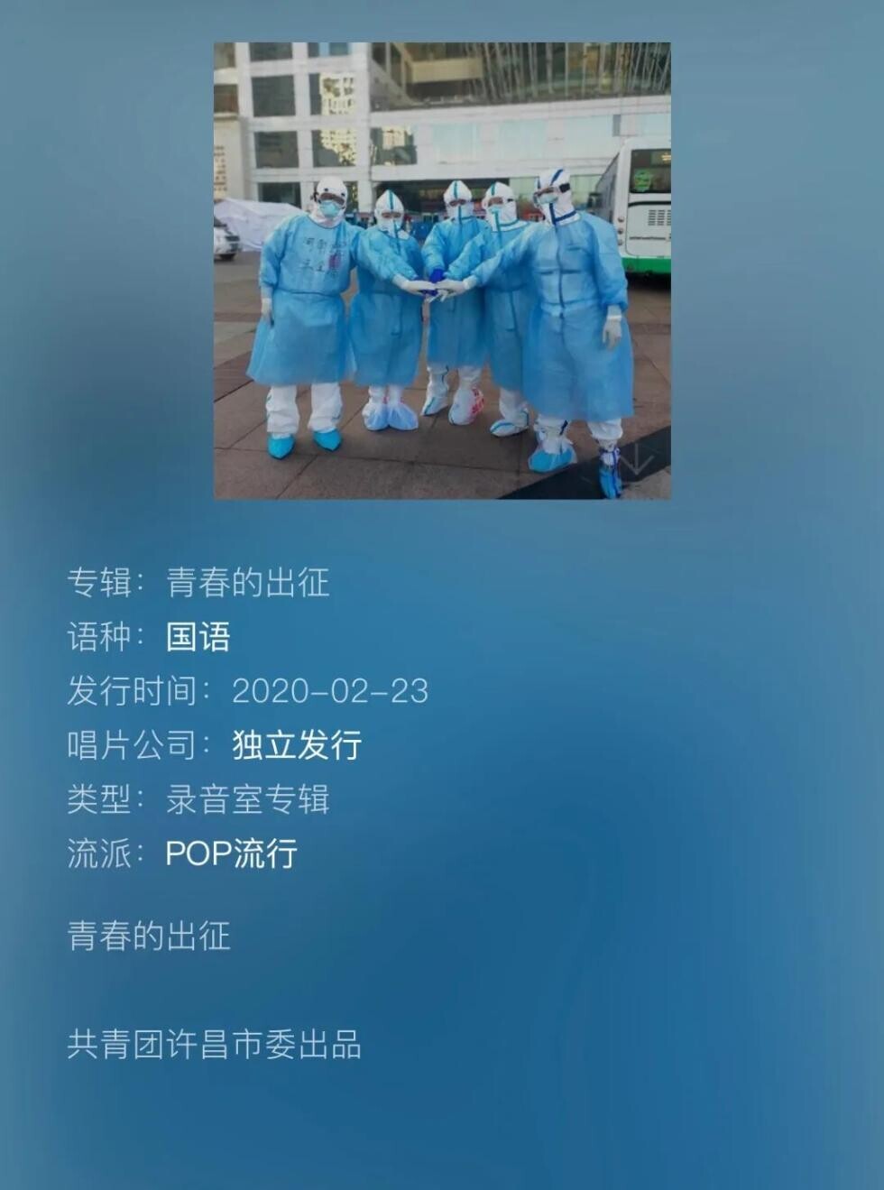 为致敬英雄,由共青团许昌市委原创出品,团市委书记何东亚同志作词,河南省一线音乐人谱曲演唱的公益歌曲《青春的出征》正式发布,并在腾讯QQ音乐同步上线。