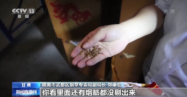 陇南市武都区烟草专卖局副局长 郑康宏:只有通过吸食才能辨别出这个烟的真假。打开以后可以看到这个烟丝,真烟的烟丝切的是相当规整,而且是颜色很亮丽,这个烟丝特别粗糙,里面还有烟筋都没剔出来,而且特别发黑,有烟末。