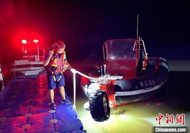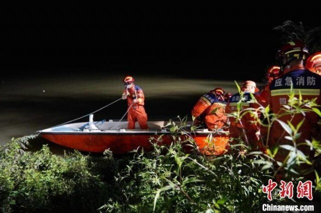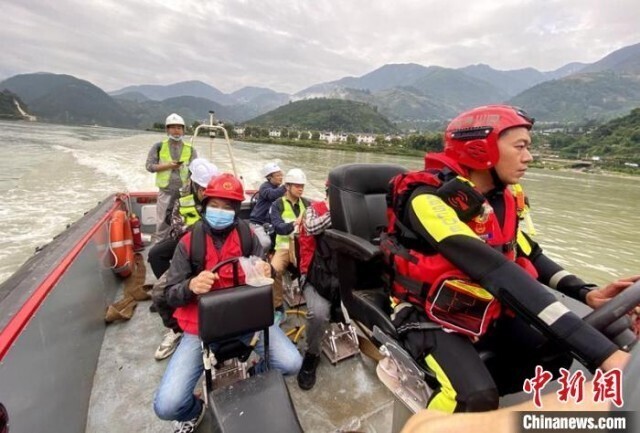 雅安消防抵达新民镇码头,利用冲锋舟转移群众。郑竺青 摄