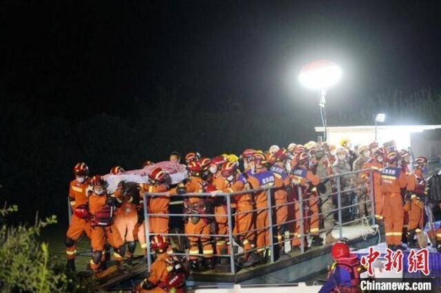 新民乡码头消防员与多方救援力量一起运送伤员。郑竺青 摄