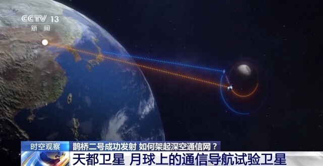 深空探测实验室天都试验星总指挥 陈晓:这个卫星主要是开展月球通信导航技术验证,两颗卫星之间通过无线电信号进行一个收发,来测量两颗卫星之间的距离。我们现在地球的通信导航卫星是比较多的,面向月球空间的,还有一些技术难度,我们要开展这些技术的先行验证。