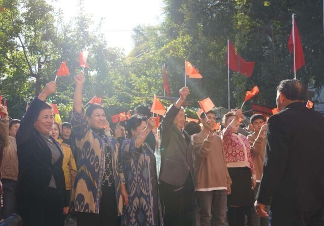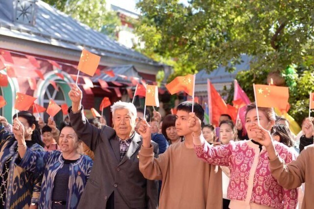 9月27日上午,新疆塔城市新城街道哈尔墩社区的一个小院里站满了人,盛开的红色鸡冠花被挤到了角落。人们手拿五星红旗,穿着本民族的服饰,准备参加一场庄严的仪式。