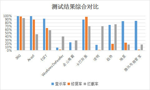 精睿安全实验室选取了360杀毒、趋势、卡巴斯基、Windows Defender等十款国内外主流杀毒软件,分别进行了查杀、修复和主动防御测试。