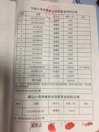 据廖德圣介绍,在他们上交了5000元“保护费”后,敖永恒又想尽办法一点一点进行敲诈。“基本上天天下来检查,发现隐患就开具罚款单,不交罚款就封闭我们的井下巷道,让我们开不了工。这就是个无底洞。”
