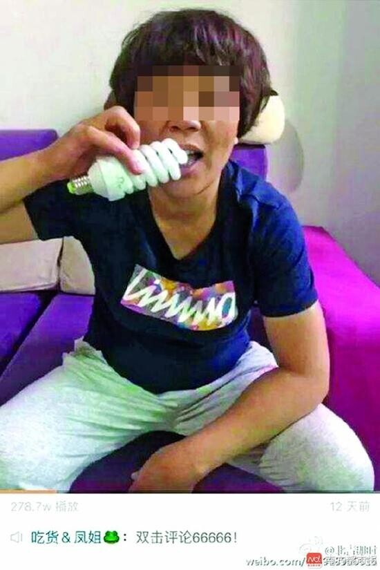 2016年6月,网名为“吃货&凤姐”的大妈在快手直播吃灯泡、仙人掌等物品走红,网友怀疑其被直播中的“侄子”控制。河北邯郸警方随后调查发现,这是一场母子二人自导自演、恶意炒作的闹剧。二人供述,“食用奇特物品”的视频是二人通过快手直播平台共同策划的,目的是为了吸引网民关注,增加视频点击量。