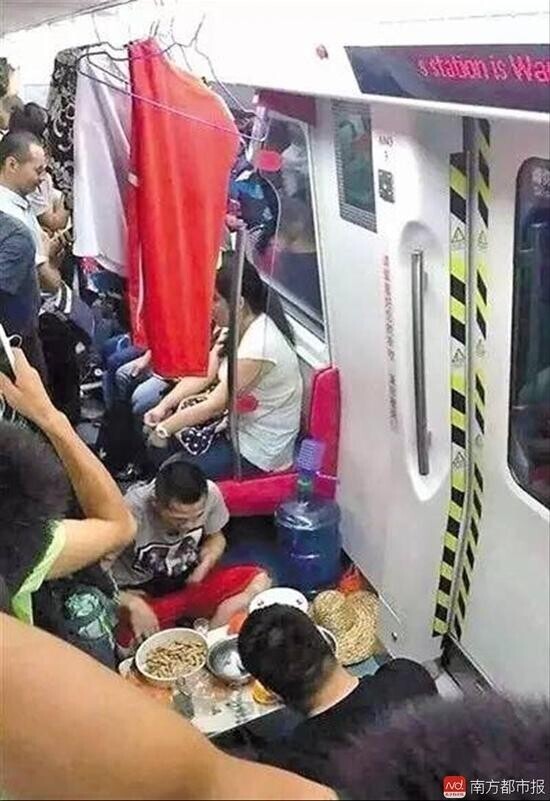 2016年5月,三名男子在广州地铁车厢里摆起小桌板,席地吃喝,其间更在车厢内晾晒衣服,并拍摄视频,现场照片在网上引发热议。随后有网友扒出其中一名男子系快手主播,此前曾直播过偷吻女性、偷拍女性等不文明行为。