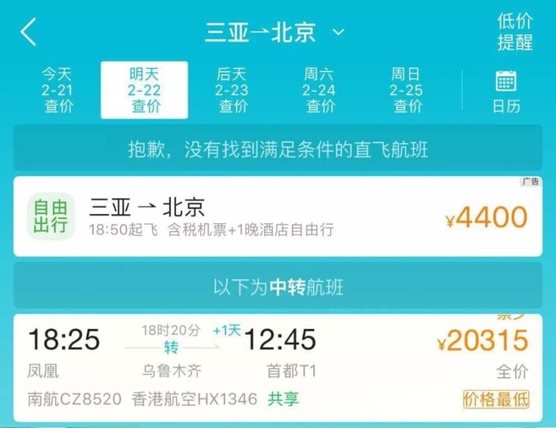 ▲22日三亚飞北京票价过两万。网络截图