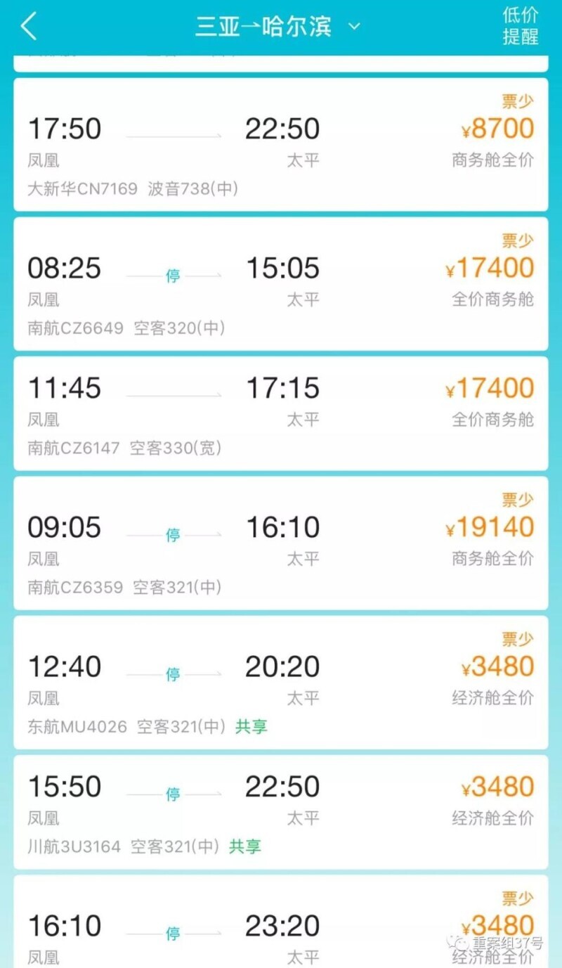 ▲三亚飞哈尔滨万元票价。网络截图
