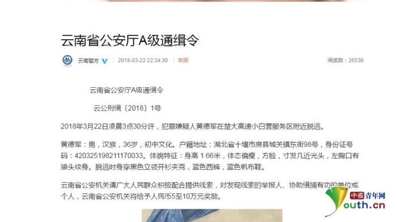 2018年3月22日凌晨3点30分许,犯罪嫌疑人黄德军在楚大高速小白营服务区附近脱逃。同时,根据网传的一份协查公告显示:涉毒在押人员黄德军从德宏州看守所转至监狱途中,在云南大理境内的楚大高速小白营停车区,趁上厕所时从厕所窗户逃脱。