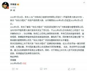 2021年5月,在了解到“快乐方程式”奶茶实际经营方为广州新锐餐饮管理有限公司,合约书中平面形象大使代言条件发生了变化后,于2021年6月1日与和成汇公司签订《合作解除协议》。“我从5月份开始一直在积极协调、处理此事,并对因此事占用公共资源表示深深的歉意。 在此,我也呼吁各位加盟商,通过合法渠道和手段表达合理诉求。”