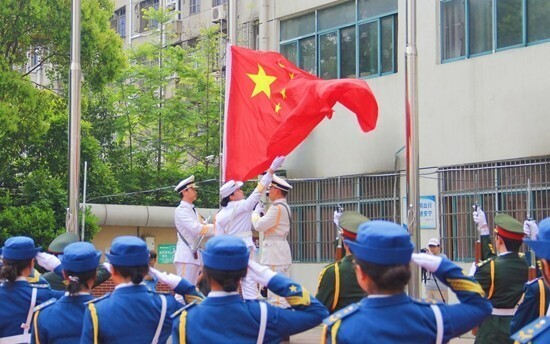 据悉,这是淮南师范学院国旗护卫队的大学生专程来到位于安徽省潜山市的野寨中学,与师生们一起开展的爱国主义教育活动。当天清晨,国旗护卫队的同学们身着戎装、神情肃穆、身姿挺拔地出现在中学操场上,他们用整齐划一的动作、铿锵有力的步履护送着国旗走向升旗台。