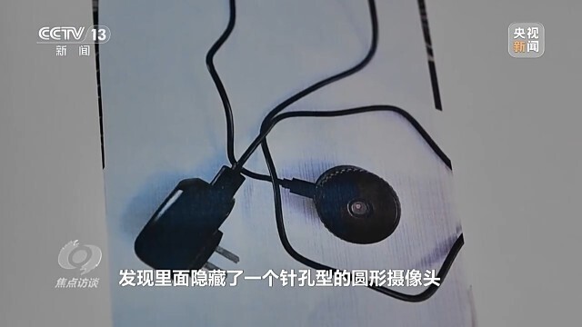 李阳:后来有一天他们休息的时候,发现这个圆形的小孔变大了,她就和她男友一起上去查看情况,发现里面隐藏了一个针孔型的圆形摄像头。