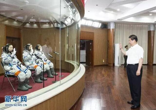 2013年6月11日,习近平来到酒泉卫星发射中心为即将出征的航天员聂海胜、张晓光、王亚平壮行。(图片来源:新华社)