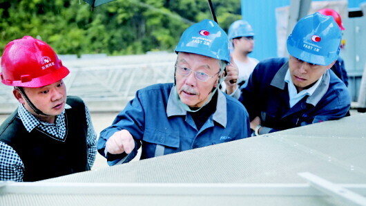 ▲ 2015年11月25日,南仁东(左二)在贵州省黔南州平塘县大窝凼施工现场指导反射面单元拼装工作。