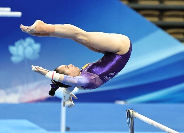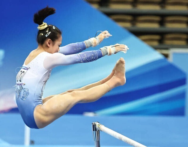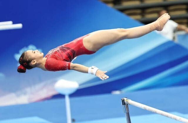 5月26日,女子个人全能冠军获得者邱祺缘在高低杠的比赛中的英姿。当日,2023年全国体操锦标赛的女子个人全能决赛在山东省济南市奥体中心东荷体育馆举行,参赛运动员们经过跳马、高低杠、平衡木和自由操4个项目的比拼,最终决出了名次。来自福建队的邱祺缘以总分108.250分技压群芳获得冠军,广东体操队的欧钰珊以总分107.150分获得亚军,浙江体操队的张清颖以总分106.800分获得季军。