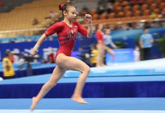 5月26日,山东省济南市奥体中心东荷体育馆,2023年全国体操锦标赛女子个人全能决赛上,邱祺缘在跳马比赛中奔跑。刘占崑/摄