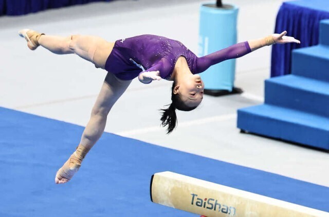 5月26日,山东省济南市奥体中心东荷体育馆,2023年全国体操锦标赛女子个人全能决赛上,山西体操队选手俞涵悦在平衡木的比赛中。刘占崑/摄