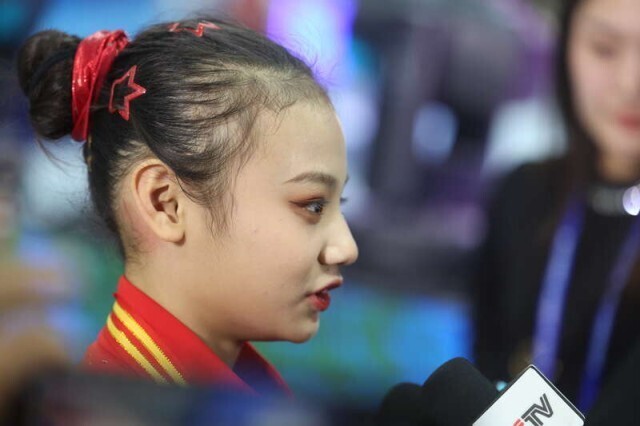 5月26日,山东省济南市奥体中心东荷体育馆,获得2023年全国体操锦标赛女子个人全能冠军的邱祺缘赛后接受记者采访。刘占崑/摄