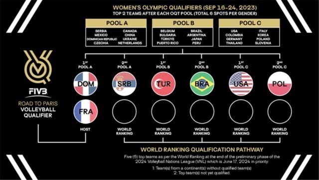 此外,国际排联还透露了巴黎奥运会排球比赛的分组办法。男排12支球队将按照2024年6月24日的世界排名进行分组,女排12支球队则将按照2024年6月17日的世界排名分组。